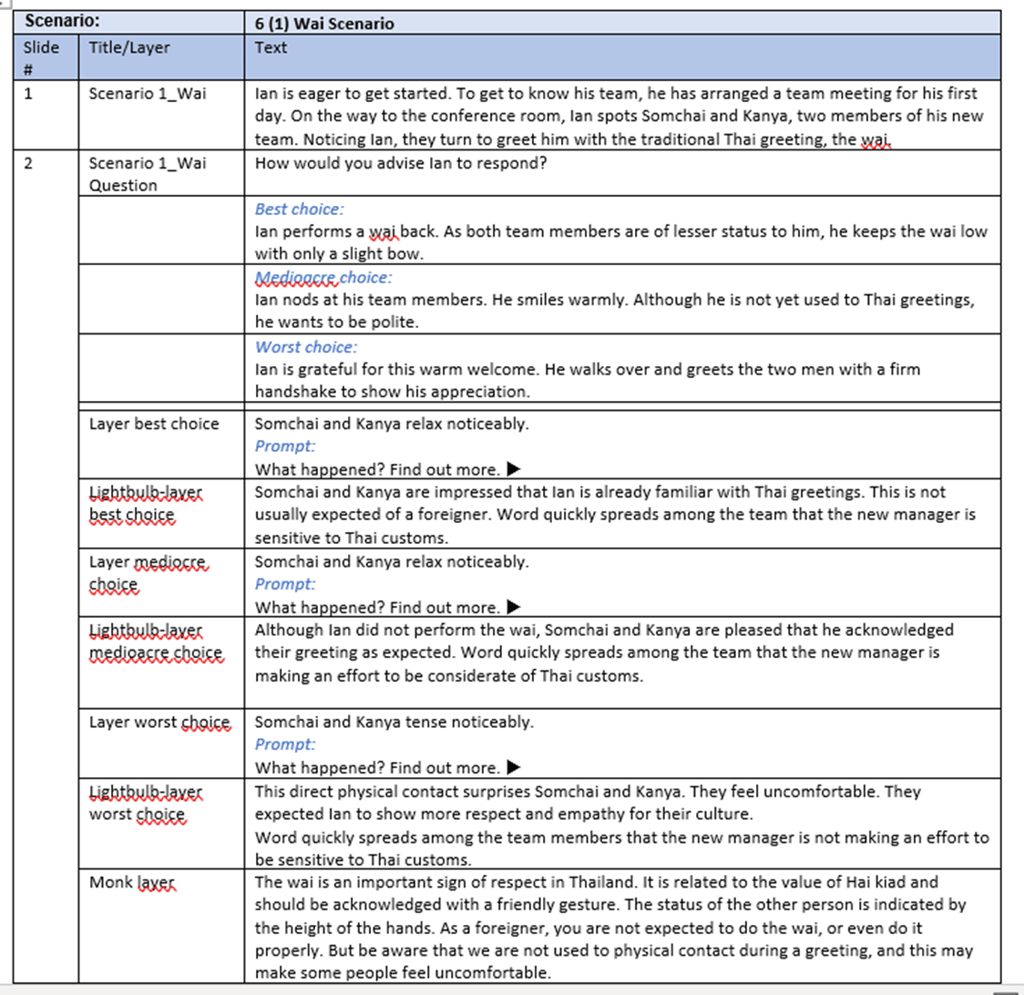 To address this, self-paced e-learning was chosen for its scalability and ability to support branching scenarios and personalised feedback. Expatriate managers assigned to Thailand need opportunities to practise culturally appropriate decision-making in realistic, low-risk environments. In line with adult learning principles, scenario-based learning supports problem-solving and real-world application while reducing the risk of costly on-the-job errors [4]. This concept project represents the first module of a broader cultural agility programme.