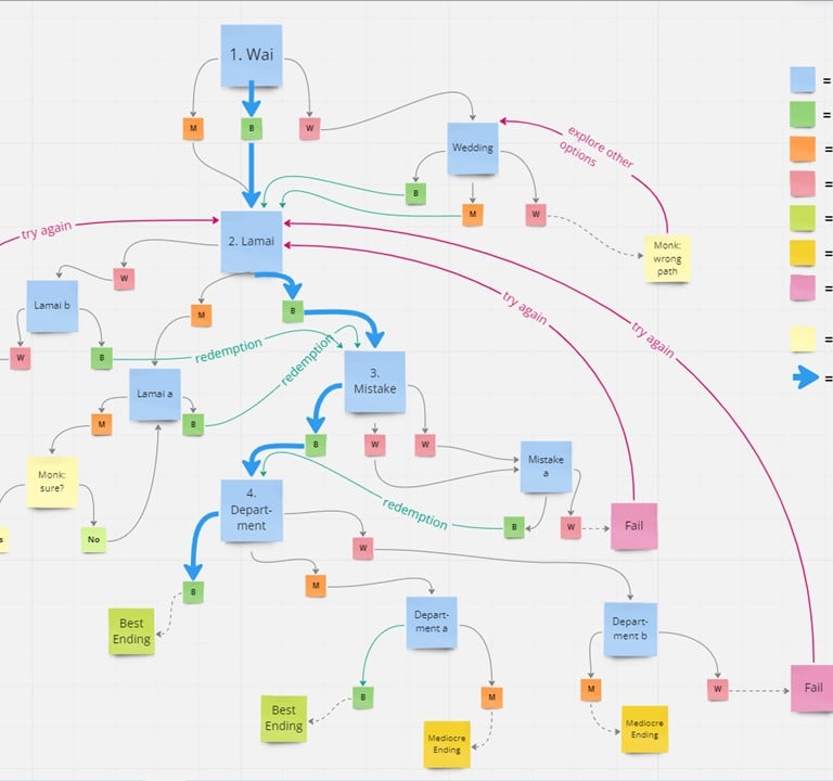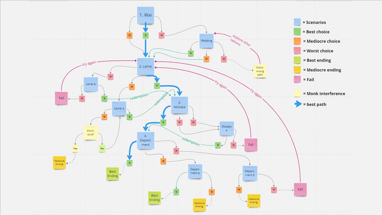 After incorporating the SME’s feedback, I mapped the branching structure in Miro. I first designed the ideal learning path, which included four key decision points (three bottlenecks). I then added alternative branches and short detours. The paths intersect at multiple points, allowing learners to practise recovering from mistakes. As a result, suboptimal choices do not automatically lead to failure, but instead create opportunities for reflection and course correction.