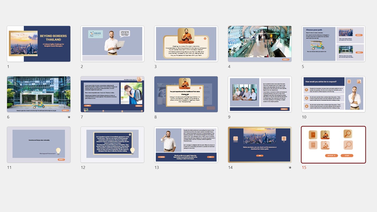 This concept project features a fictional UK-based biopharmaceutical company, Evolvise. The scenario-based e-learning experience supports managers relocating from the UK to Thailand in building culturally effective working relationships with local teams. Learners navigate realistic, low-risk workplace scenarios and experience the consequences of their decisions in an unfamiliar cultural context. Optional, on-demand cultural agility content is embedded throughout the course to support reflection and informed decision-making at key moments.