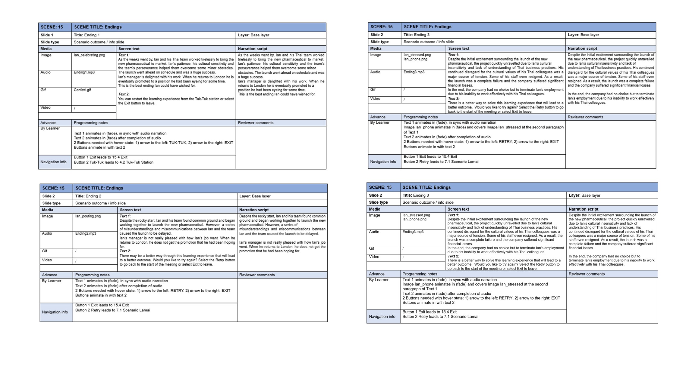 The main character, Ian, is a white male manager in his 40s, reflecting the typical profile of mid-level managers in UK-based organisations and aligning closely with the target audience. This choice was made to maximise relevance and identification. In a real client setting, character design would be adapted to organisational needs and could include alternative protagonists, such as a female manager, to address gender-related dynamics in cross-cultural contexts. The overarching goal was to create a relatable, likeable character that encourages engagement and motivation to see the character succeed.