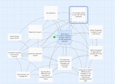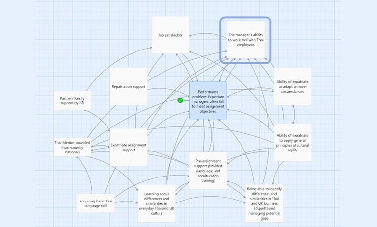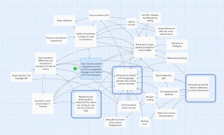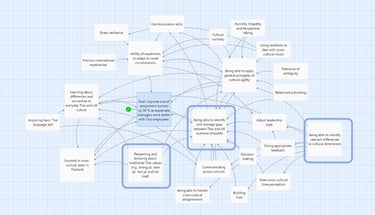 Next, I defined a measurable performance goal for the learning experience (Goal: increase assignment success by 30% through improved collaboration with Thai employees; Action Map 2). Together with the SME, I identified observable behaviours that managers would need to demonstrate—or avoid—to achieve this goal. I then analysed the relationships between these behaviours and ranked them according to their impact on the business outcome.