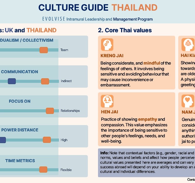 The target audience consists of mid-level managers from Evolvise’s UK headquarters assigned to Bangkok, Thailand. While this group is typically male and in their 40s, their prior exposure to Thailand, local business culture, and cultural agility skills varies widely. Some may have gained basic experience through travel or previous international assignments, while others may be entirely new to cross-cultural work.