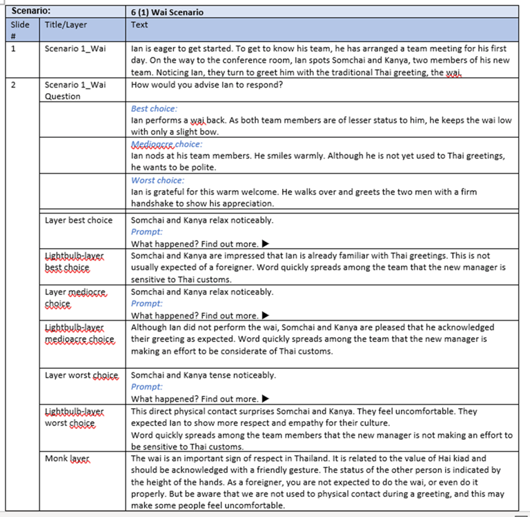 The scenario takes place on Ian’s first day at the Bangkok office and centres on events leading up to and including his first team meeting. Before developing the branching structure (see 3. Development), potential mistakes and consequences identified during the research phase were prioritised based on their relevance to the core learning objective: improving working relationships with Thai staff.